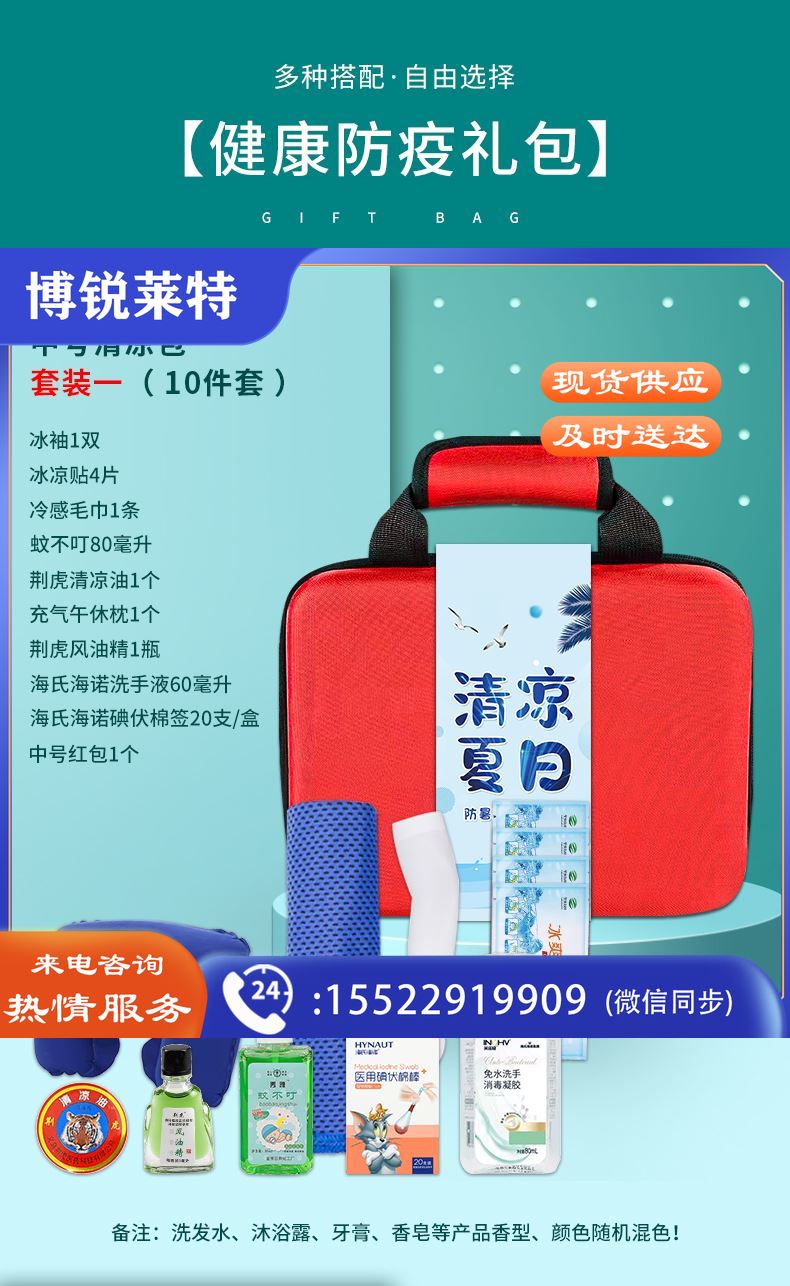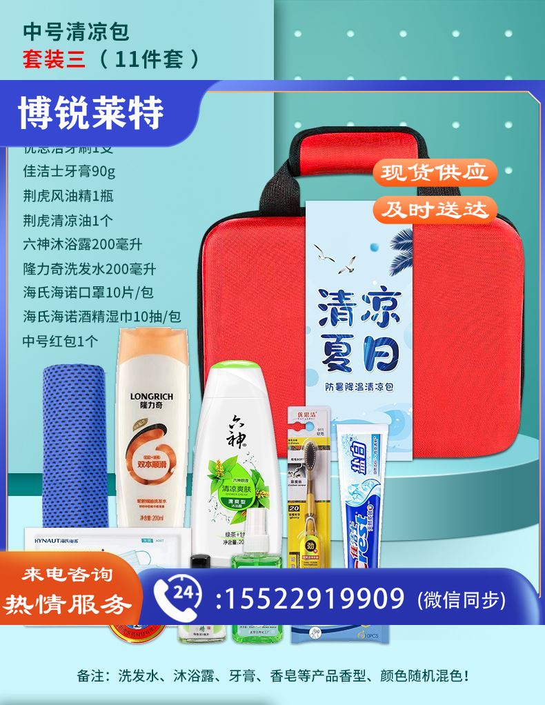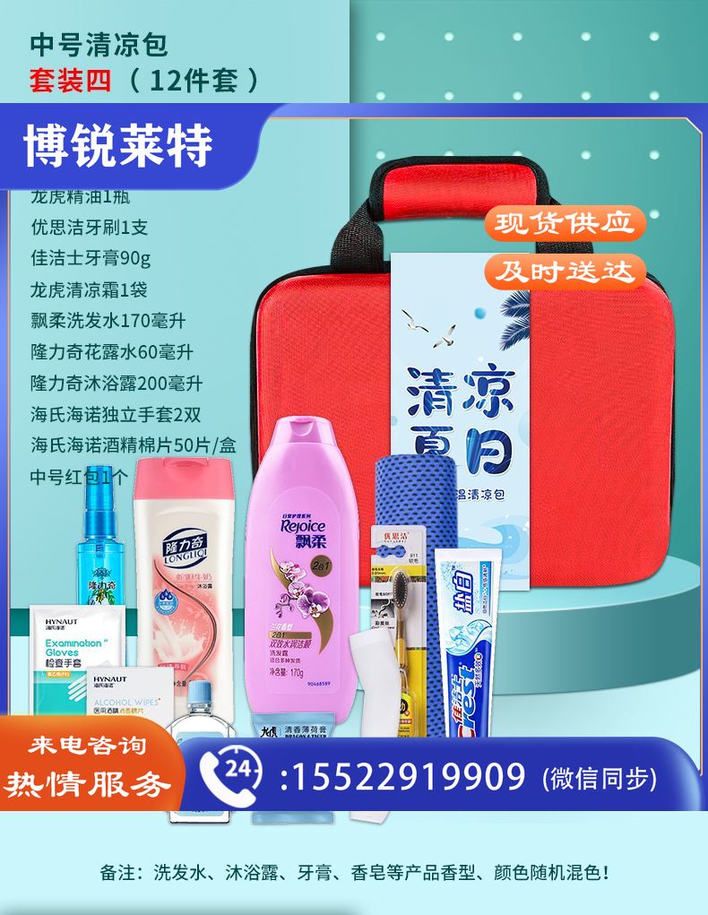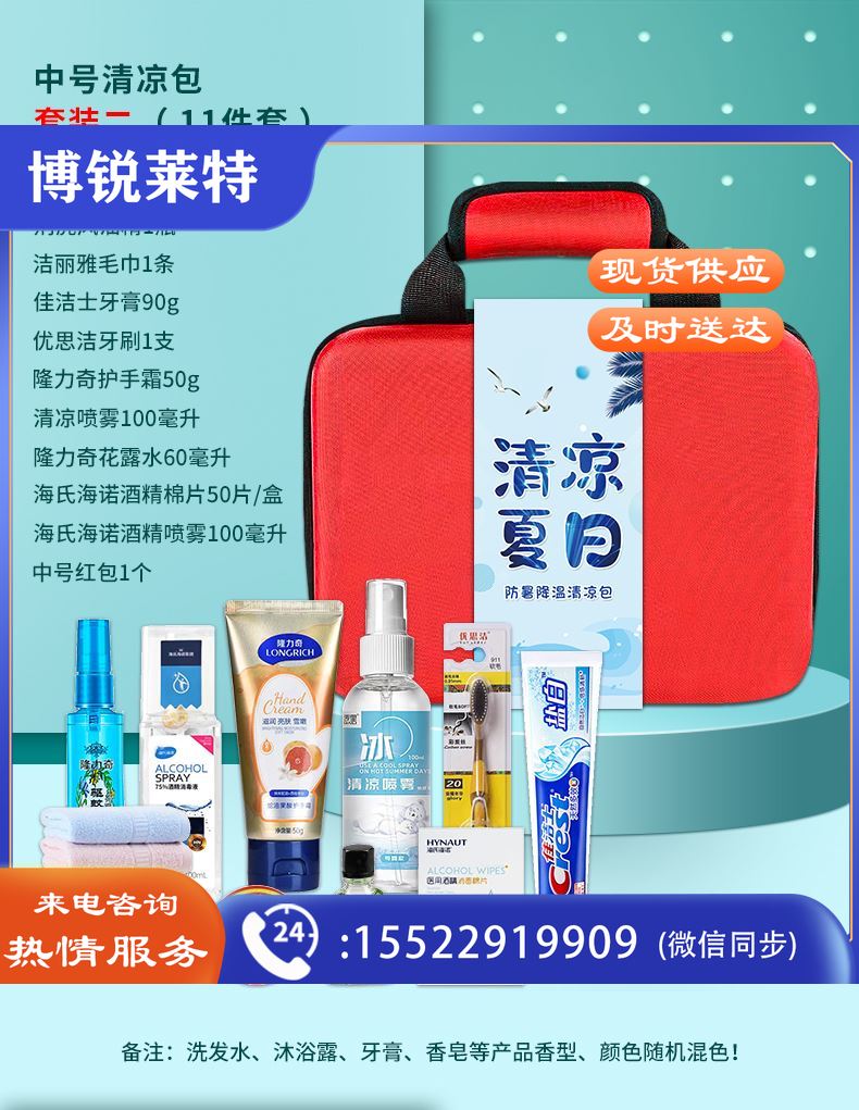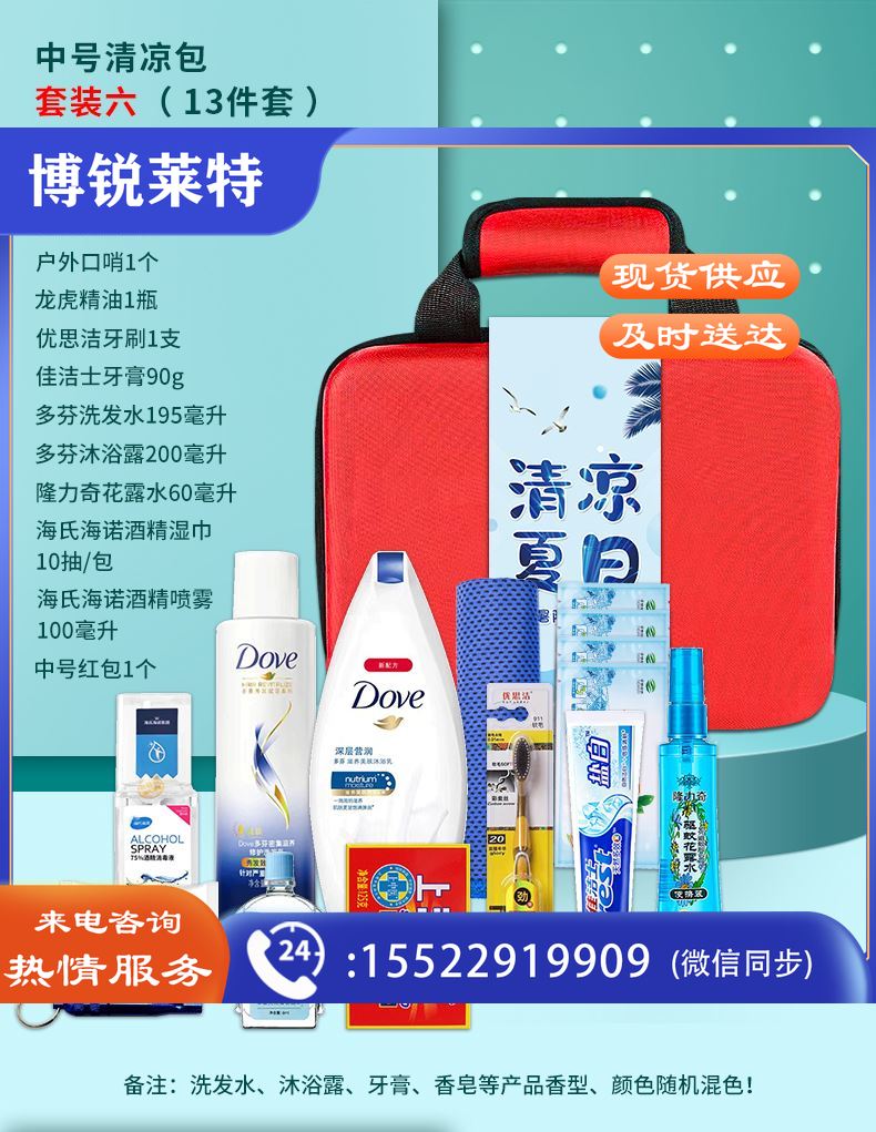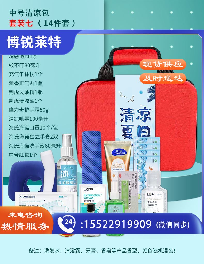 起订量:2装箱数:201.注:商城报价对应首张主图款式! 其他套装参考细节图,费用另计! 2. 咨询下单请备注好产品信息! 3.首图款式产品明细:中号清凉包套装四(12件套):冰袖1双、冷感毛巾1条、龙虎精油1瓶、优思洁牙刷1支、佳洁士牙膏90g、龙虎清凉霜1袋、飘柔洗发水170毫升、隆力奇花露水60毫升、隆力奇沐浴露200毫升、海氏海诺独立手套2双、海氏海诺酒精棉片50片/盒、中号红包1个