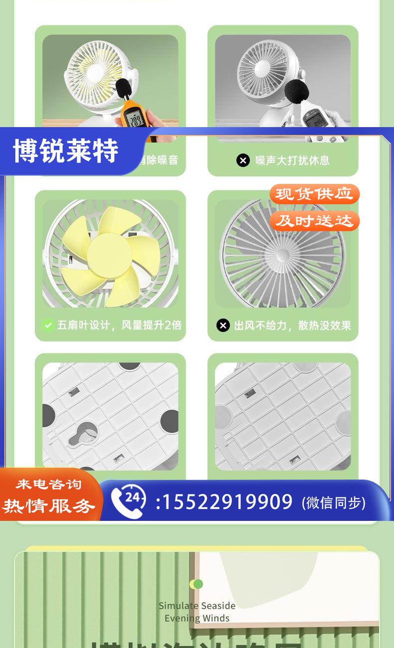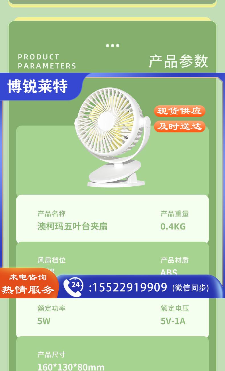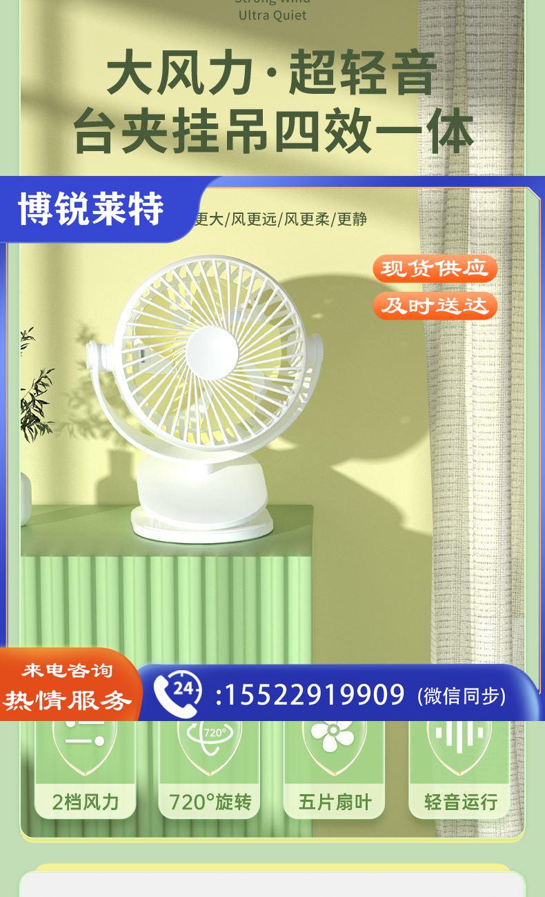 装箱数:60额定功率:3W档 位:2档毛 重:0.3kg净 重:0.25kg产品尺寸:155*90*165mm装 箱 数:60pcs轻音运行 ≤50db超大出风面2档风力 720度旋转 台夹壁挂两用 多场景适用。