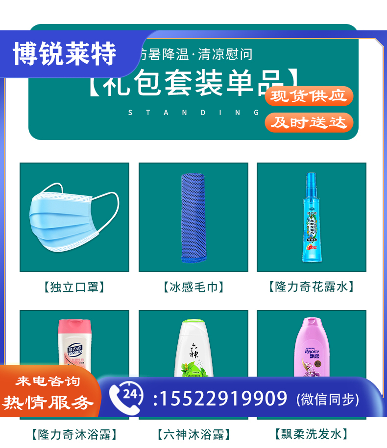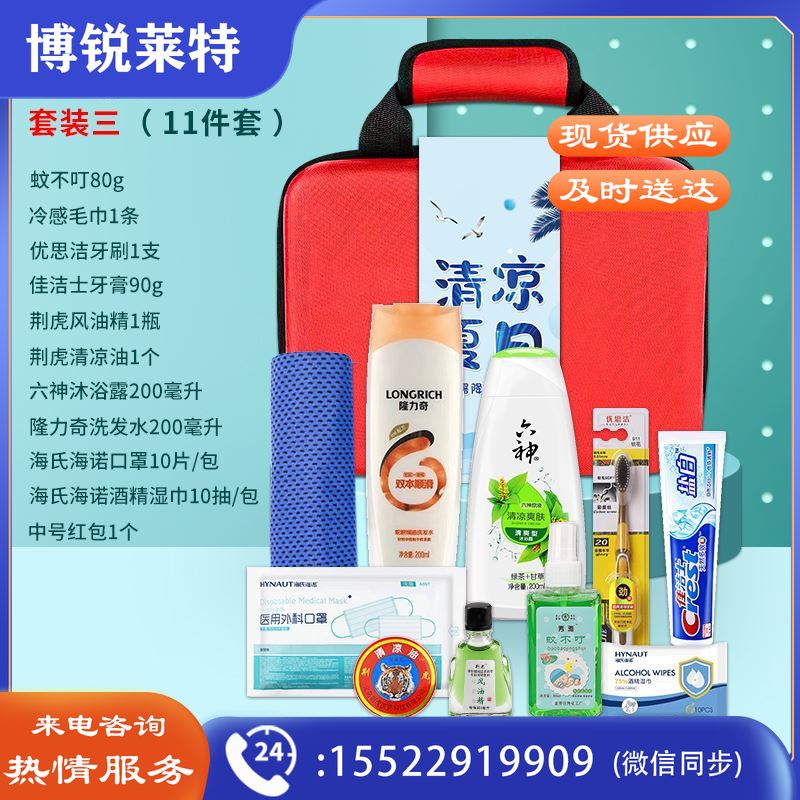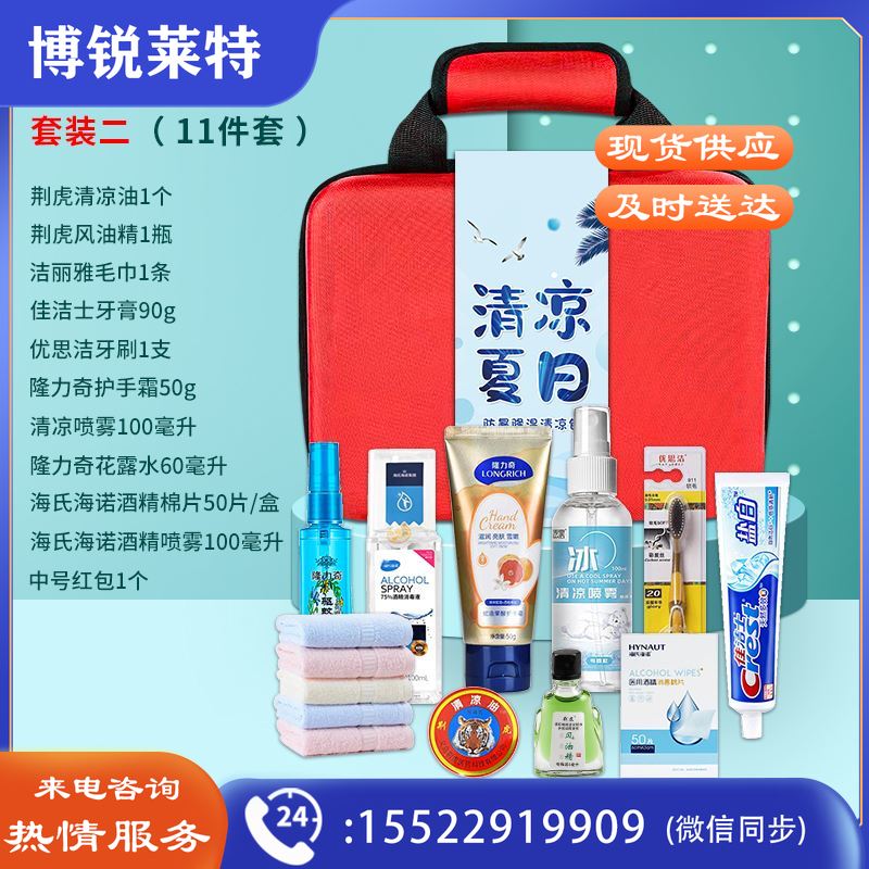 起订量:2装箱数:201.注:商城报价对应首张主图款式! 其他套装参考细节图,费用另计!2. 咨询下单请备注好产品信息! 3.首图款式产品明细:中号清凉包套装一(10件套):冰袖1双、冰凉贴4片、冷感毛巾1条、蚊不叮80毫升、荆虎清凉油1个、充气午休枕1个、荆虎风油精1瓶、海氏海诺洗手液60毫升、海氏海诺碘伏棉签20支/盒、中号红包1个