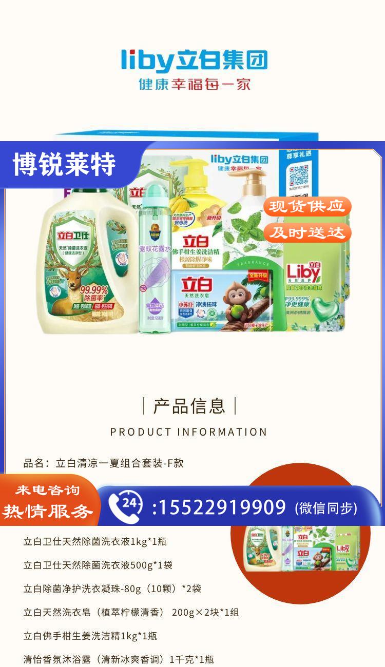 起订量:12装箱数:6配置:立白卫仕除菌洗衣液1kg*1瓶立白卫仕除菌洗衣液500g*1袋立白除菌净护洗衣凝珠-80g(10颗)*2袋立白洗衣皂(植萃柠檬清香) 200g×2块*1组立白佛手柑生姜洗洁精1kg*1瓶清怡香氛沐浴露(清新冰爽香调)1千克*1瓶超威露隐白花驱蚊花露水195ml*1瓶